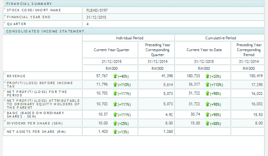 昨天元宵佳节,富佳木材公布了不错的业绩盈利。业绩以及盈利算算突破了历史新高,EPS是10.37仙,比去年同期上涨了111%。2015年的全年营业额以及税后盈利分别上涨了20%以及98%。笔者将会小小分享一下个人对FLBHD所做的功课。