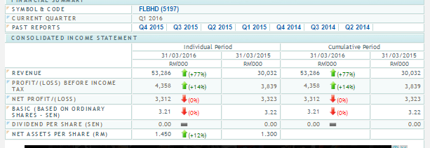 FLBHD的业绩在5月20日出炉,盈利从去年Q1的3.323 mil下跌到最新的3.312 mil,盈利下跌了RM11,000。不过营业额按年计算却上涨了77%,也就是上涨了23.2 mil。现在市场都对FLBHD感到非常悲观,应该不少人会选择在星期把FLBHD卖掉, 很大可能性会出现惶恐性暴跌。不过在决定买卖之前,你是否读完整份季度报告,知道了所有的前因后果吗??