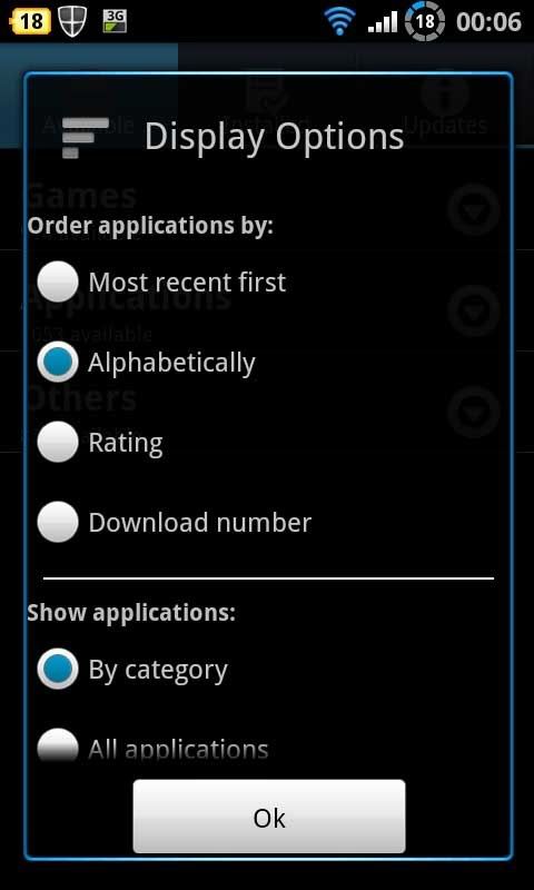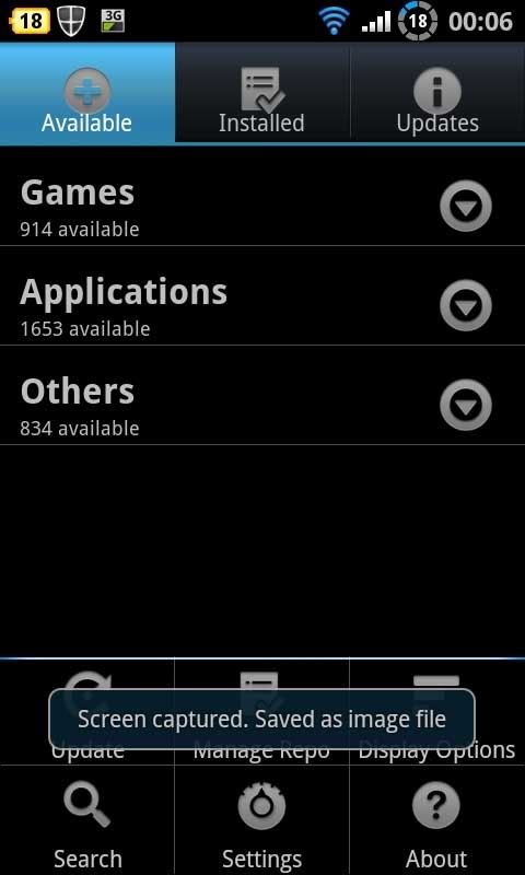 当你按 “Menu” 时,这个就会出现。分别是 Update, Mange Repo, Display Option, Search, Setting 跟 About. 我将会个别介绍/解释。