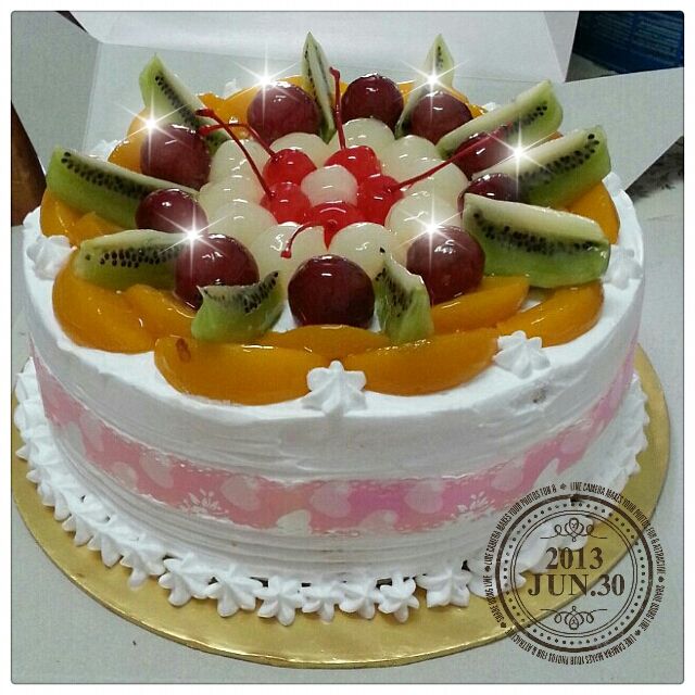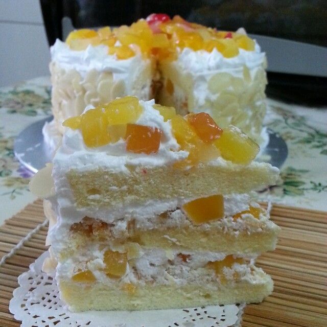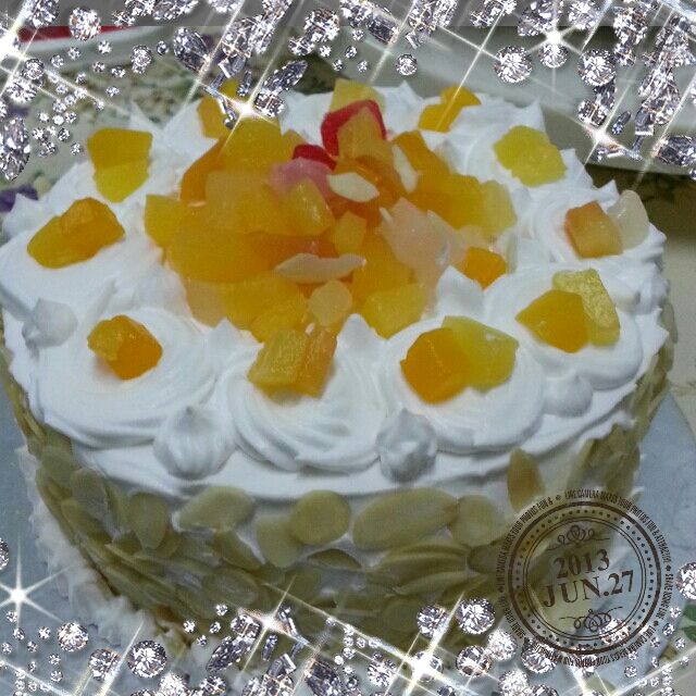 第一次尝试做蛋糕,也是第一次自己亲手做的~水果蛋糕~有咪有美美?哈哈。。没有美,丑就有。第一次涂抹鲜奶油,真是考功夫啊!功夫不到家,只能用杏仁片贴边遮丑了,嘻嘻。。