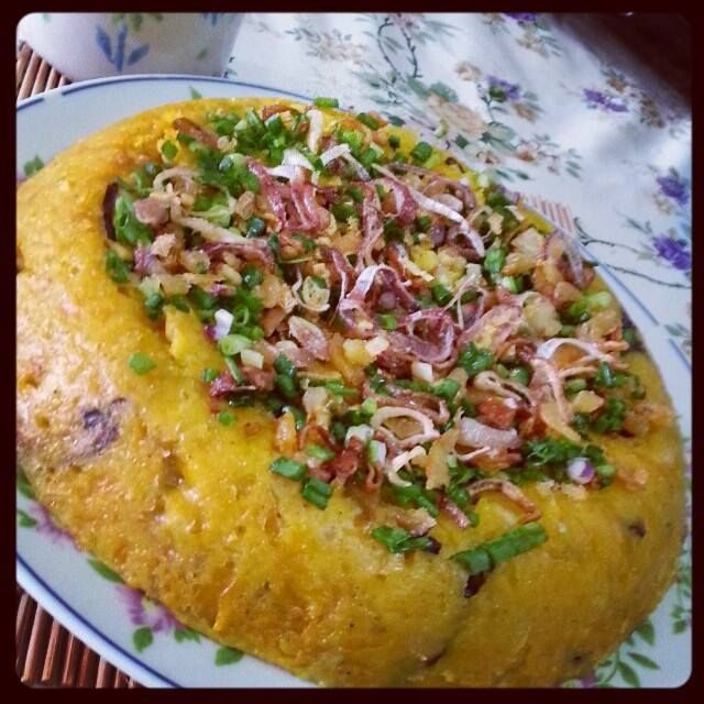 1. 馅料加调味料炒香。 2. 加入调好的米浆,小火搅煮至浓稠。