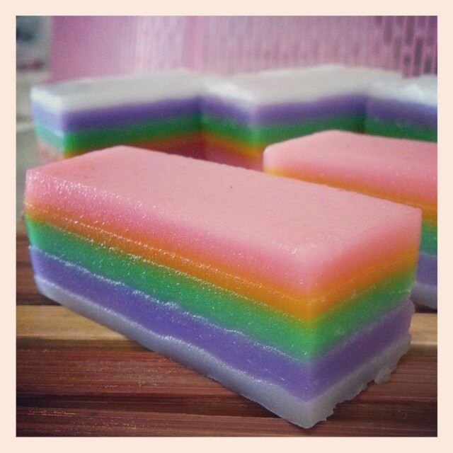 2.模具抹油,放入蒸鍋以中大火蒸5分鐘後開蓋,倒入一份的米漿,蓋上鍋蓋蒸3、4分鐘,不粘手時就倒入第2份的米漿,蓋上鍋蓋蒸3、4分鐘至到全部粉漿分別加入,最後一層蒸12分鐘即可熄火,取出。