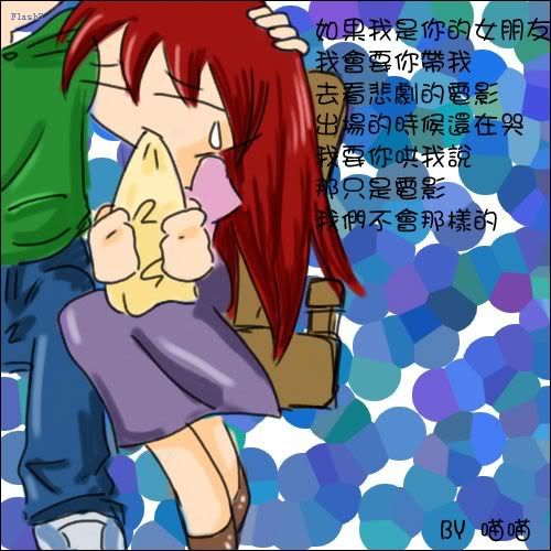 但幸运之神遗弃了我,在中秋节那天,我姐姐,我,我妹妹,泰和鸿围在蜡烛旁聊天,聊着聊着,姐姐忽然说要玩真心话游戏,要彼此给彼此的外表打分,满分是10分…鸿给了我7分,妹妹5.5分,姐姐6分;姐姐则给鸿多分于泰,妹妹给泰多分于鸿,轮到泰给分了,他给了妹妹5分,姐姐4.5分,而我3.5分…听了我真的想当场哭出来,但爱面子的我没有酱做,到我给分时,我第一次对泰说谎,我给鸿的分多于泰~之后找了个理由,在半夜3点多近4点,躲在浴室冲了冷水澡,让自己的眼泪随着冷冷的水释放自己的悲伤…第一次,我觉得自卑极了,信心离我好远好远,远到自己找寻不到…接下来他们说什么我都没听入耳了,他弟弟,鸿很体贴,他知道我喜欢他哥哥,也知道我受伤了,所以他要我坐在他旁边(本来我一个人坐得远远的),然后总有意无意地开导我,并试着让我没酱伤心~