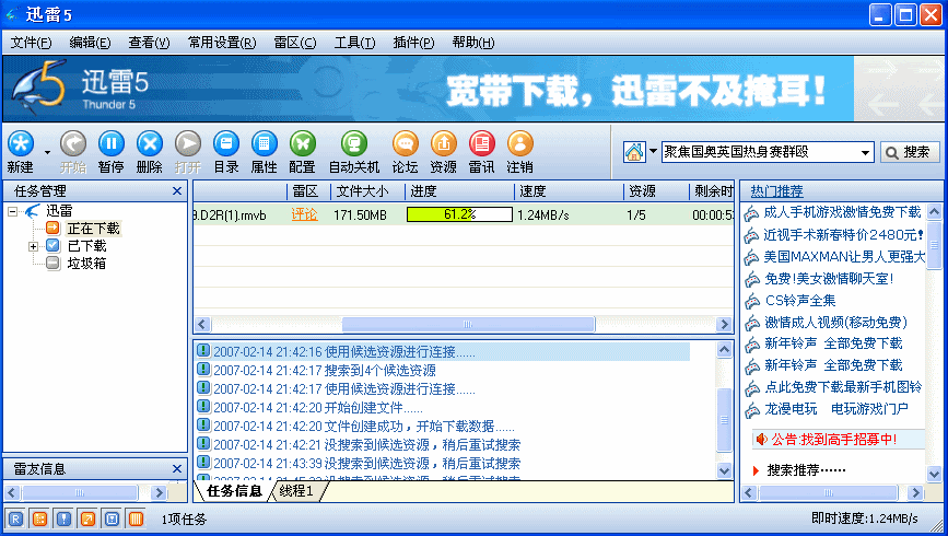 8Mbps 才能下载1mb/s , 迅雷也采用p2sp 的方式,所以速度可以超过stramyx 给的速度。1Mbps 有很多人可以飚到120-130kb/s 。这个贴上次bt 下载速度是2.44MB/s 的差不多。可能是streamyx 那边搞错了吧,或则给里面的人kopi 钱,叫他们把速度放到maximum . |