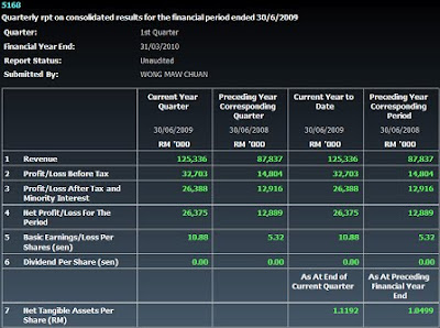 今天来谈谈这家主要业务为生产与销售电路板的GUH。刚刚宣布的上半年09年度的业绩让股东们兴奋。公司半年累积每股票盈利10.39分。业绩报告中说明,尽管营业数额下滑了4.6% 从RM 127.3 million 至(2008: RM 133.4 million),但税前盈利扣除了股票投资上的赚益以后,真实的税前营运赚益切增加了43%至 RM 17.0 million (2008: RM 11.9 million),这是因为投资在中国方面的制造厂这季度贡献出亮丽的成绩。
