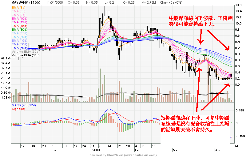他是用短期和中期的瀑布線來確定趨勢的。。。