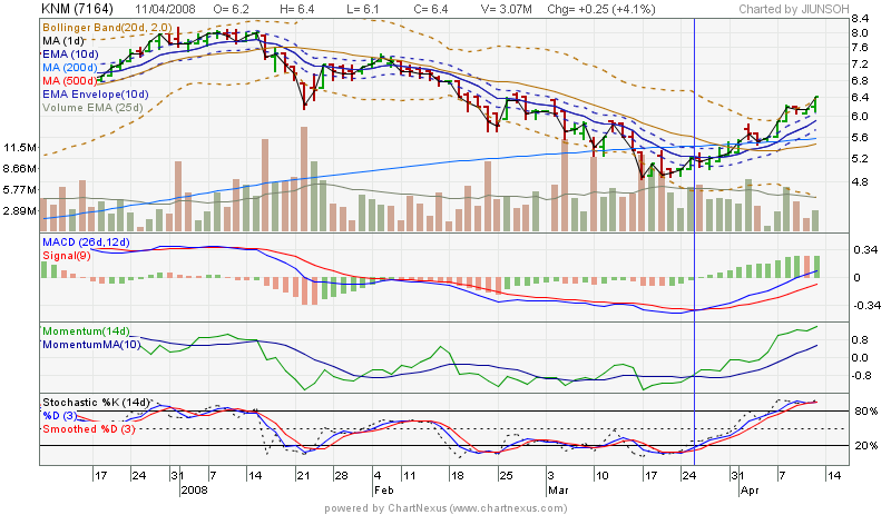 还有我有一直注意MACD失准的时候。看knm 05/02 和14/03要进行黄金交叉的时候就股价崩跌,强先买进的人就中招了,airasia好几次也是这样。 |