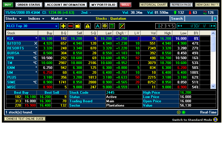 | Code | Stock | Close | Last | Chg% | Vol | BuyRate% | P/E | DY | 市值 (百万) | | 5099 | AIRASIA | 1.37 | 1.32 | -3.65 | 20576 | 46% | 6.23 | - | 3,133.45 | | 2291 | ASIATIC | 8.05 | 8 | -0.621 | 3699 | 60% | 17.5 | 2.00% | 6,049.27 | | 5076 | ASTRO | 3.4 | 3.3 | -2.941 | 2994 | 52% | - | 3.00% | 6,382.32 | | 1562 | BJTOTO | 4.94 | 4.88 | -1.215 | 4611 | 62% | 16.59 | 7.00% | 6,593.03 | | 1899 | BKAWAN | 10.3 | 10.1 | -1.942 | 757 | 31% | 12.56 | 5.00% | 4,403.11 | | 1929 | CHINTEK | 7.3 | - | - | 0 | 0% | 16.4 | - | 666.95 | | 6947 | DIGI | 23.7 | 23.9 | 0.844 | 3656 | 42% | 16.87 | 10.00% | 17,925.00 | | 5398 | GAMUDA | 3.28 | 3.26 | -0.61 | 34799 | 62% | 15.01 | 14.00% | 6,531.63 | | 3182 | GENTING | 6.45 | 6.4 | -0.775 | 25456 | 28% | 11.89 | 6.00% | 23,703.08 | | 5819 | HLBANK | 5.95 | 5.95 | - | 2381 | 29% | 14.03 | 4.00% | 9,401.64 | | 2216 | IJMPLNT | 3.54 | 3.54 | - | 6168 | 38% | 42.75 | 1.00% | 2,260.63 | | 1961 | IOICORP | 7.3 | 7 | -4.11 | 111898 | 52% | 29.01 | 1.00% | 42,918.43 | | 5060 | KINSTEL | 1.21 | 1.2 | -0.826 | 14813 | 45% | 8.01 | 1.00% | 1,090.54 | | 2445 | KLK | 16.5 | 16 | -3.03 | 9760 | 26% | 24.55 | 3.00% | 17,080.08 | | 7164 | KNM | 6.4 | 6.25 | -2.344 | 23999 | 42% | 34.45 | 1.00% | 6,559.43 | | 2003 | KULIM | 7.25 | 7.05 | -2.759 | 12272 | 47% | 4.9 | 1.00% | 2,140.47 | | 7177 | LCL | 5.7 | 5.65 | -0.877 | 421 | 44% | 13.79 | 2.00% | 403.44 | | 2887 | LIONDIV | 1.29 | 1.26 | -2.326 | 880 | 38% | 1.48 | 2.00% | 928.90 | | 8621 | LPI | 11.4 | 11.3 | -0.877 | 85 | 27% | 17.73 | 10.00% | 1,567.57 | | 3735 | MAGNUM | 3.36 | 3.36 | - | 11249 | 2% | 11.86 | 23.00% | 4,867.11 | | 1155 | MAYBANK | 8.25 | 8.25 | - | 21555 | 59% | 9.99 | 10.00% | 40,268.89 | | 5077 | MAYBULK | 4.34 | 4.34 | - | 12485 | 21% | 7.97 | 9.00% | 4,340.00 | | 1295 | PBBANK | 10.8 | 10.9 | 0.926 | 39083 | 46% | 17.21 | 7.00% | 38,497.99 | | 7201 | PICORP | 0.575 | 0.575 | - | 20634 | 99% | 4.24 | 2.00% | 378.35 | | 4065 | PPB | 10.2 | 10.5 | 2.941 | 11996 | 47% | 1.78 | 3.00% | 12,447.75 | | 4715 | RESORTS | 3.34 | 3.28 | -1.796 | 53931 | 36% | 11.96 | 2.00% | 19,261.41 | | 4197 | SIME | 9.1 | 8.85 | -2.747 | 63868 | 52% | 14.65 | 3.00% | 53,183.75 | | 2267 | TANJONG | 16.2 | 16 | -1.235 | 5416 | 39% | 11.64 | 6.00% | 6,452.10 | | 4677 | YTL | 7.6 | 7.5 | -1.316 | 9605 | 46% | 15.4 | 3.00% | 12,231.61 |