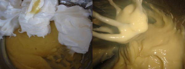 4.打发的蛋白一半加入蛋黄糊内拌匀~再加入其余的蛋白拌匀