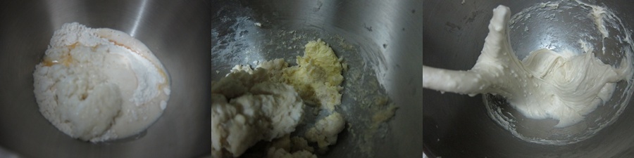 4.奶油加入後,麵團與奶油搅均勻至成為略撐的起薄膜的麵團 就差不多完成