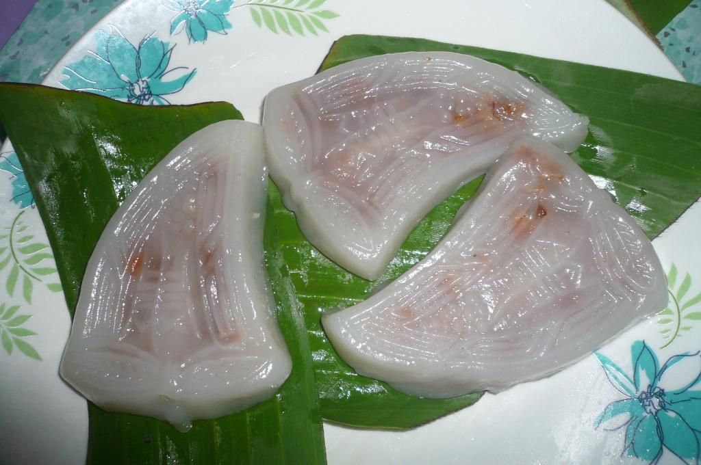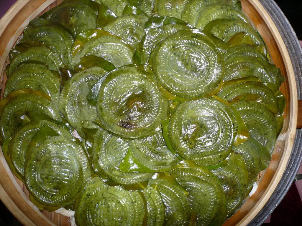 问了也不知道什麽树叶的汁,糕的底部也是那种叶子。是吃到像是糯米糕内馅是豆沙。