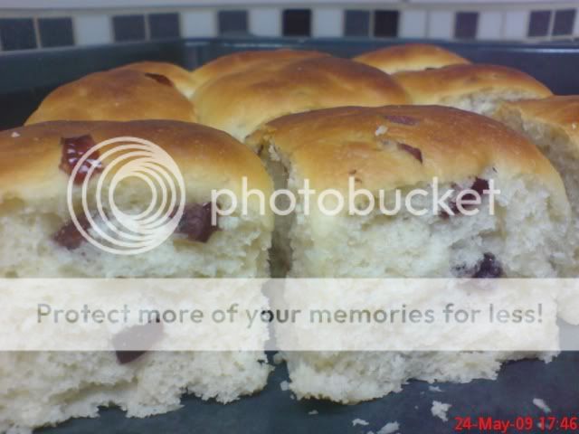 到了那天我做奶香土司时,我竟然把它当成了高粉来做土司 ,当然土司是失败了,我那时还以为是奶粉的问题呢!没想到我今早也犯了同样的错误,做了这个cranberry面包.(原本要做土司的,发觉用错材料后,又不想丢掉,就做了这个小面包试看咯)