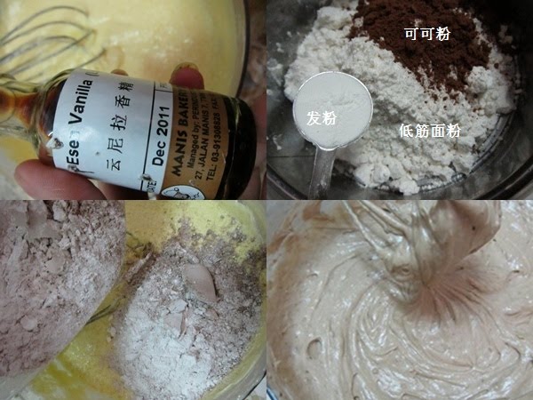 3.再將過篩好的粉類與咖啡牛奶分2次交錯混入攪拌均勻成為無粉粒的麵糊