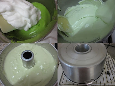 6.然後再將拌勻的麵糊倒入蛋白霜中7.將麵糊用橡皮括刀由下而上翻轉的方式混合均勻