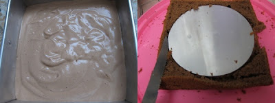 8.倒入鋪上白報紙的烤盤中用括板抹平整.進爐前在桌上輕敲幾下敲出較大的氣泡 ,放入已經預熱到170度C的烤箱中烘烤12-15分鐘