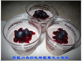8)在蛋糕上放上一汤匙蓝莓酱,