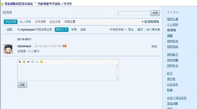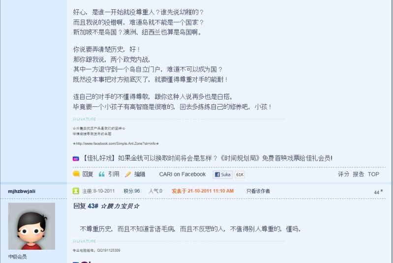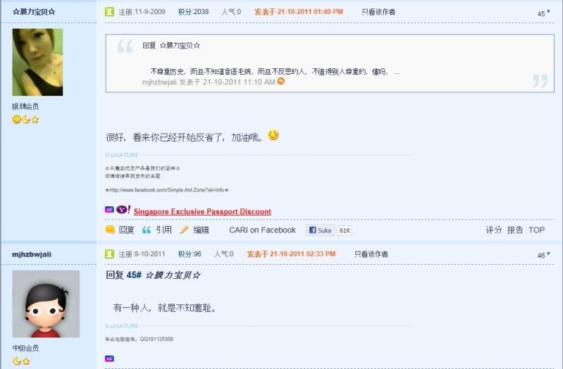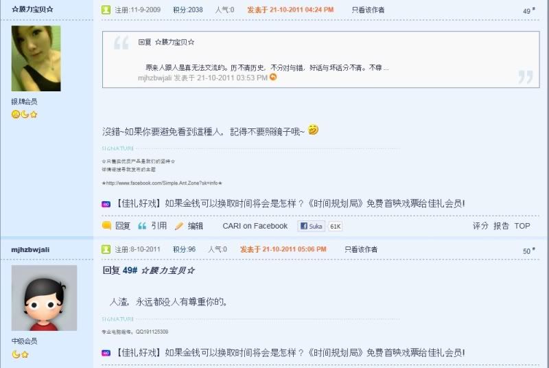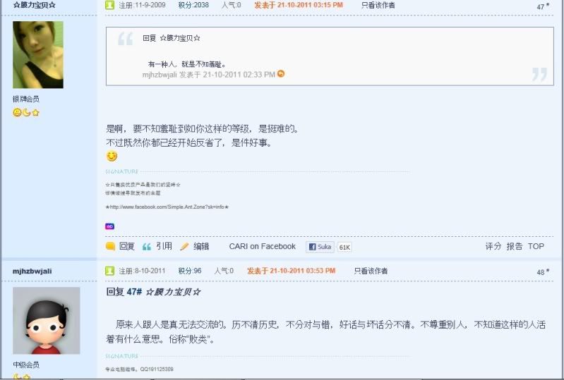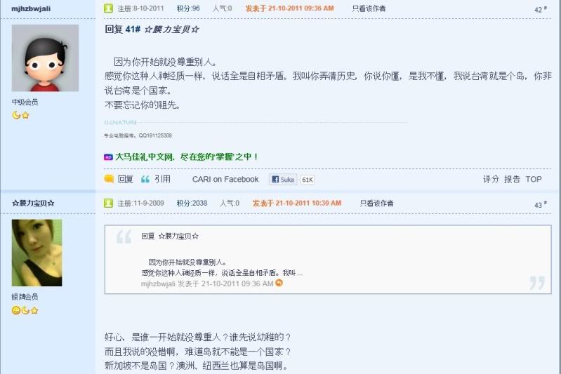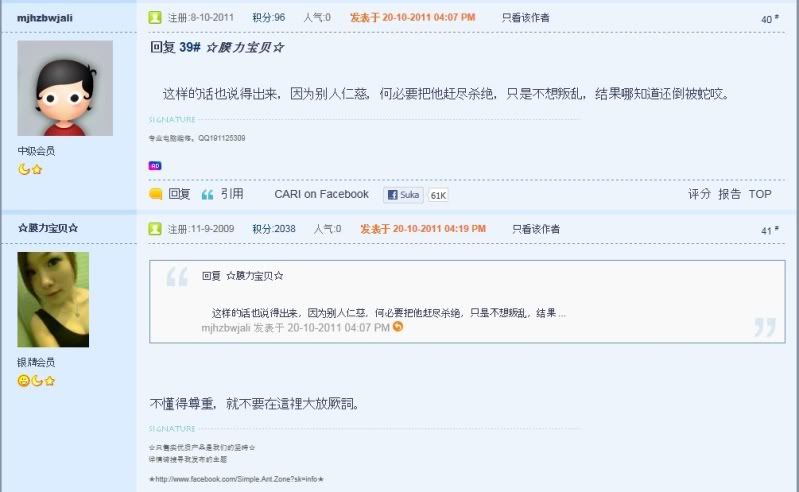 话是这么说没错,但是那个人的态度就很欠扁。 我已经声明我的立场是要尊重对方了,他还不明白。 ☆膜力宝贝☆ 发表于 22-10-2011 12:13 PM