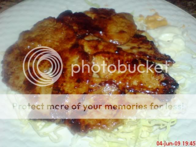 蜜糖猪扒,下面的是切丝的包菜,沾美奶芝和千岛酱,小侄女一直吵着说:我要吃那个甜甜的菜.