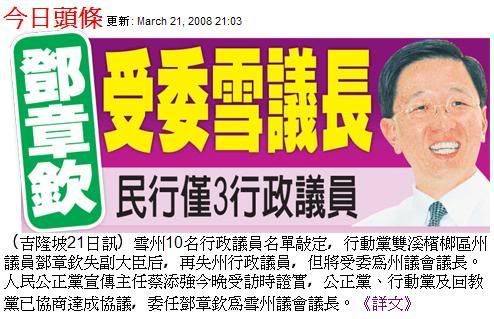 公正黨、行動黨及回教黨已協商達成協議,委任鄧章欽為雪州議會議長。