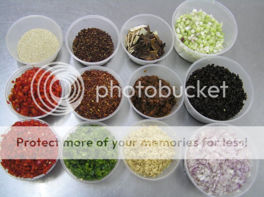 [麻辣酱料的配方] 白芝麻,红辣椒,灯笼椒(青红) ,蒜米,洋葱,上等辣椒干,黑豆是,豆瓣酱,花椒,八角,肉桂,当归,川芎,葱白
