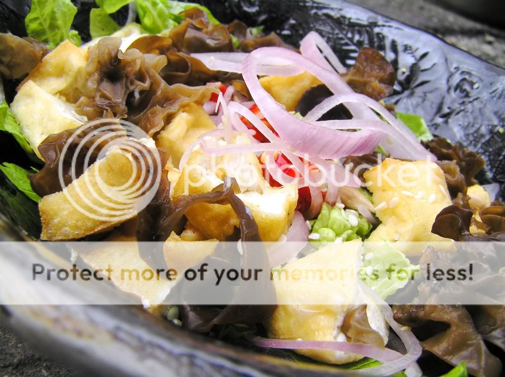 头也沉重,走到厨房看到了经理在骂人了,厨房也犯糊涂的事情,少读了一份单子;赶紧弄了出去后,我看到刚刚炸好的豆腐,这豆腐最近刚找到的家庭式的,味道非常浓郁口感扎什,豆香味浓,有少许五香的气味;看到金黄色的豆腐,就想到泰国式的沙拉,于是顺手就叫人准备材料,弄了一盘新的沙拉.