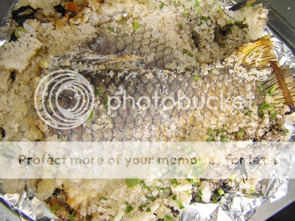 材料: 大鲈鱼尾(2KG以上的鲈鱼),海盐,芫西,洋葱,当归片,辣椒干,锡纸