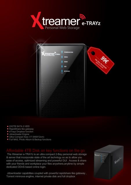 新产品,Xtreamer NAS (可以支持4TG的3.5"硬碟,支持megaupload, jdownloader等等),原价99euro, xtreamer用户可享有40euro折扣。如果xtreamer + NAS一起买,价钱是99euro + 59euro + 40 euro = 198euro. 要十一月才可以开始订购。