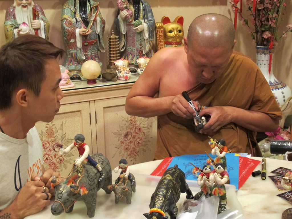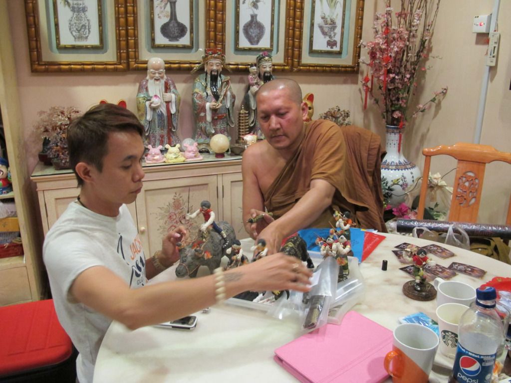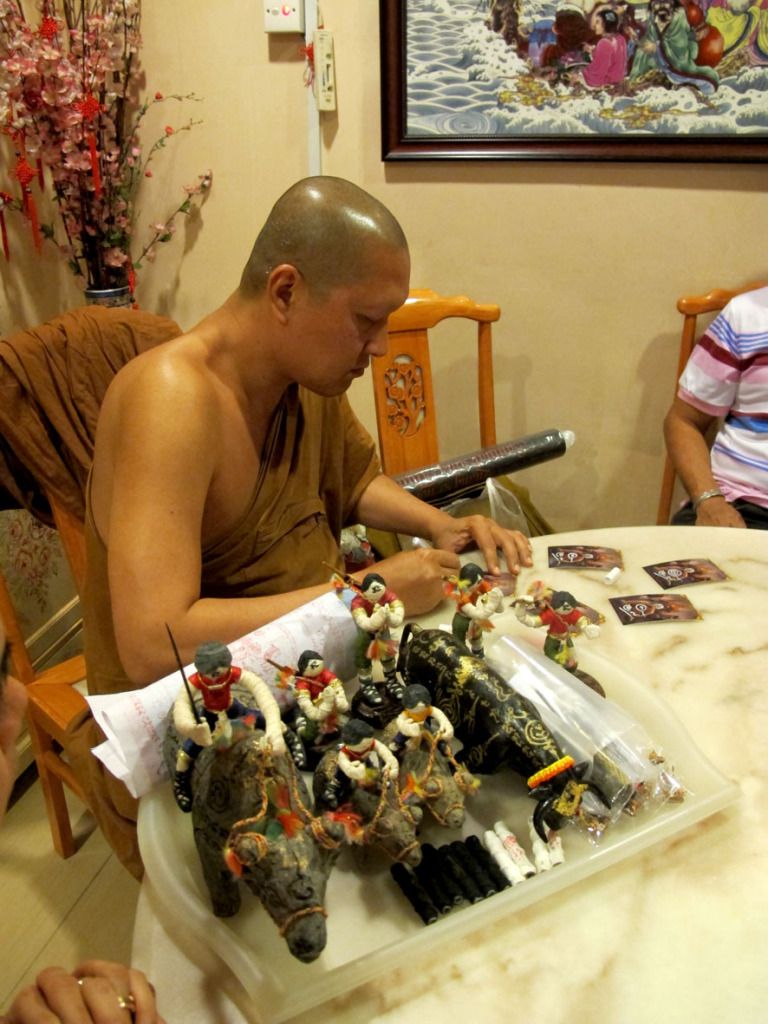 朋友跟师傅请了不少圣物师父很累了~~但还是逐一为圣物写经文架持~~感恩呢~~