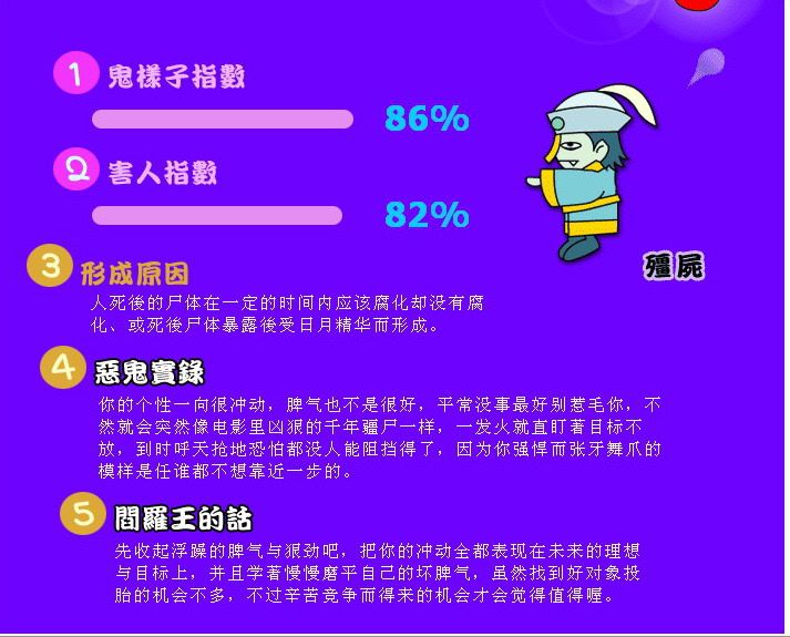 你看似一付小霸王的模樣,其實腦子裡常隱藏著許多古靈精怪的想法,能力不錯的你有機會就會一路衝到底,但成功後卻容易出現自負的態度,所以偶爾就稍稍收歛點,學著謙虛待人,說不定早就有機會投胎,而不是徘徊在鬼界稱王囉。