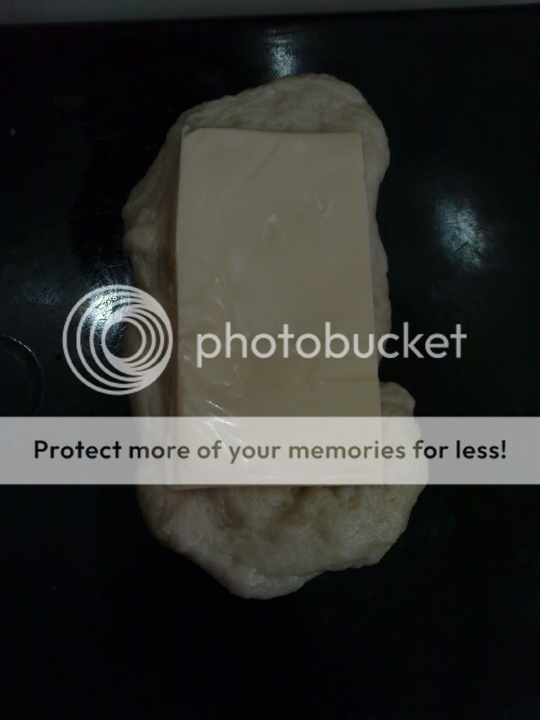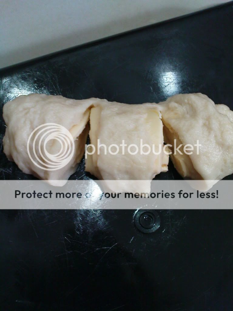 * 面团发酵完成后,取出面团,搓揉长条,用手撕小片Cheddar Cheese一点一点铺在长条上,然后香肠顺着面团长条卷,卷好后放在铺了烘培纸的烤盘(放2杯热水在烤箱里)里待发半个小时或发酵至一倍大.