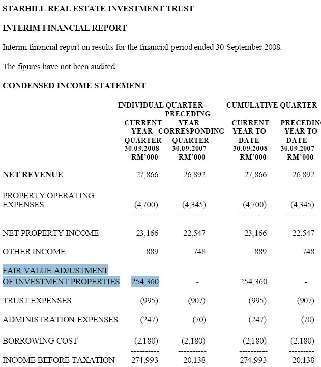 STARHILL REAL ESTATE INVESTMENT TRUST - 30/9/2009 Financial Sumarry Study一早给星洲财经的YTL业绩相关报道吓了一大跳, 什么STAREIT的最新一季盈利由多少亿大跌到几千万...