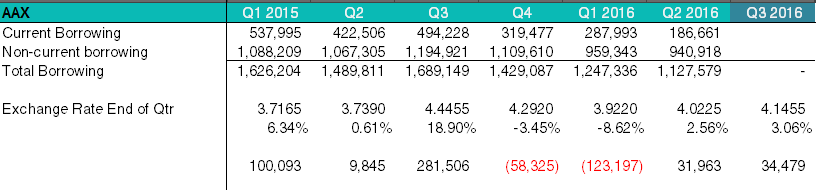 AAX对美金汇率的影响已经在上几个季度大幅度降低Borrowing之后,