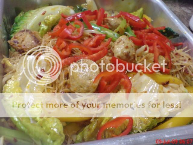 炒米粉很普通而已,炒香蒜蓉和肉丸,加入米粉,加水和BELACAN辣椒,炒一会,加入青菜和一点的盐或生抽炒到米粉熟就可以了.
