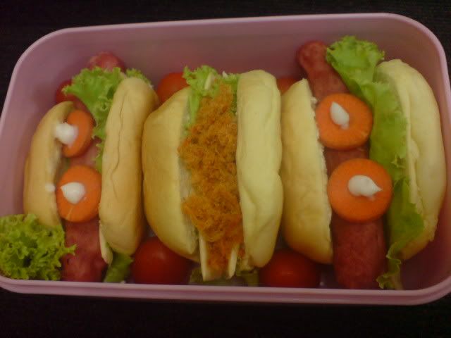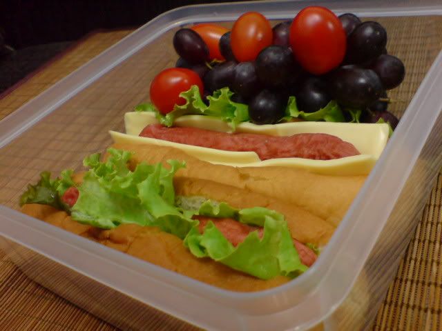 婴儿面包汉堡便当 BABY BUN =婴儿面包? 那天在TESCO看到小小粒的BABY BUN 觉得可爱下, 这个就是人家西餐用的面包哦, 也像KFC的BUN 本来要放水果的, 那里知道贪吃的自己, 一大把的葡萄 在晚餐后 吃光光 所以便当 没有水果吃了 呜呜呜