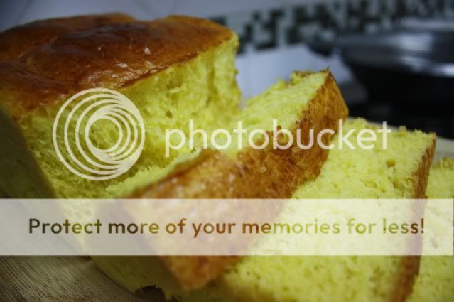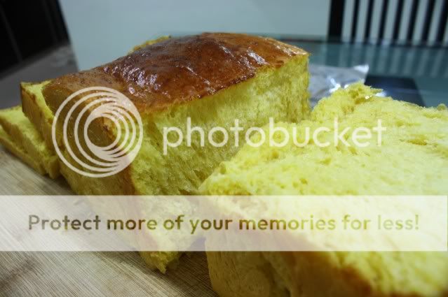 直接法的南瓜土司.这土司在做的时候,面团都非常的美,不会粘手,发酵时间也相当快.烤好后有达到我要的颜色,很黄很美,又够软,但口感和组织就是正统直接法的比较粗.(奇怪,我上次做的奶香土司也是直接法的,但组织真的很美)会不会是南瓜的问题呢?(我好像在CARI有看过说南瓜有某种成分是会影响面包的,所以酵母份量得减少)