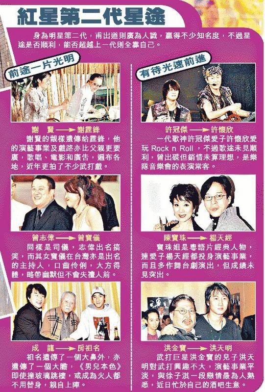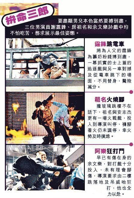 谢霆锋近年来出演的电影有不少的动作打斗,在《无极》(blog)中出演无欢,《龙虎门》、《新警察故事》也有激烈打斗场面,就连暑假期间即将上影的《男儿本色》、《双龙记》也同样用了大量动作充场,谢霆锋将成新一代打星。张柏芝怀孕后的不良新闻是越传越神,小谢即将出世,而快为人父的谢霆锋也大赚奶粉钱,成龙(blog)、李连杰(blog)、甄子丹(blog)等动作演员都坦言身体透支,谢霆锋为赚奶粉钱身体也透支的厉害,《双龙记》工作人员透露,谢霆锋休息的时一动不动,原来打完之后全身都酸疼,不过谢霆锋却拍的非常卖力,在动作电影《双龙记》中将带来全新的功夫。 |
