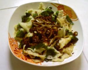 这碗是他的,面粉粿厚厚(他喜欢厚厚的,比较有嚼劲)多多,料少少。炒了香香的肉碎香菇酱,配上炸葱及炸江鱼仔,好吃。。。