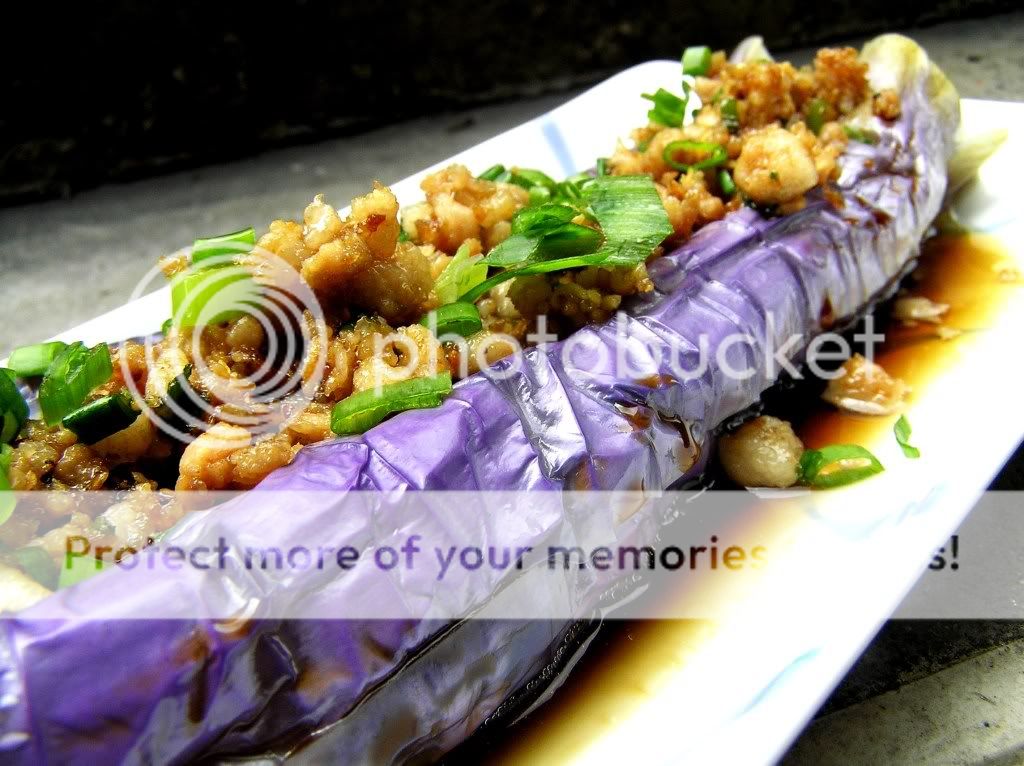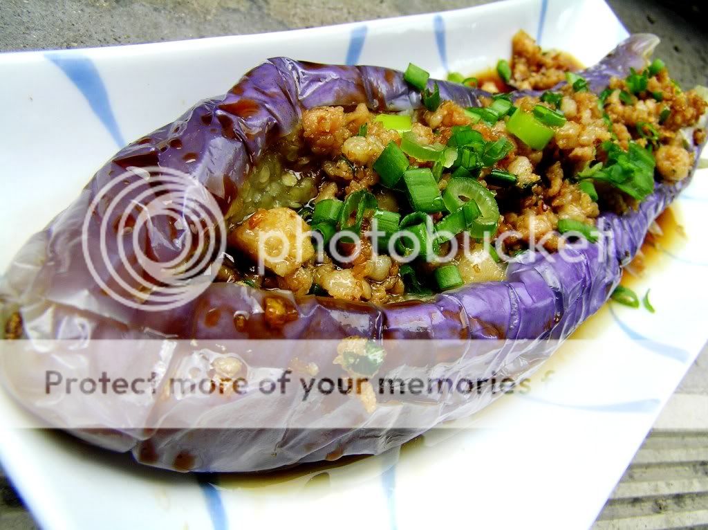 3。煮好的茄子,摆盘后,将爆香的肉碎倒入