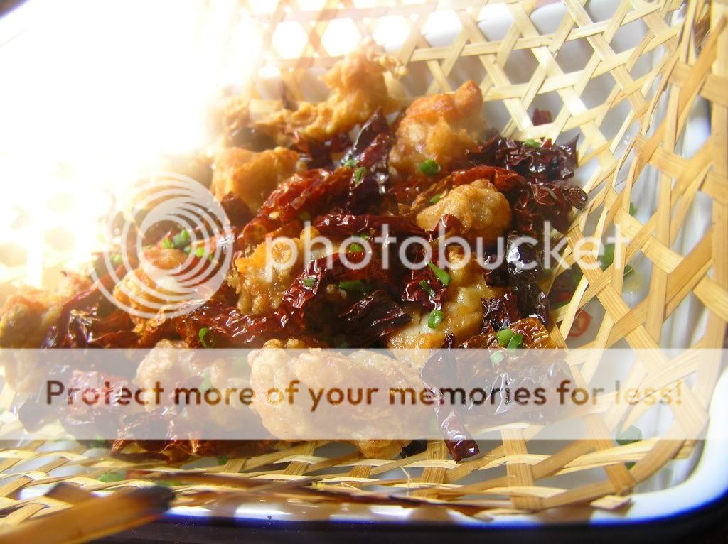 3。辣椒干切成半寸,大量,过油松脆取出,和鸡块合搅,再将青葱撒上即可