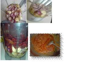 2.把适量的油加进搅拌杯里,然后加入香茅,洋葱,辣椒干,亚三水和马来煎..