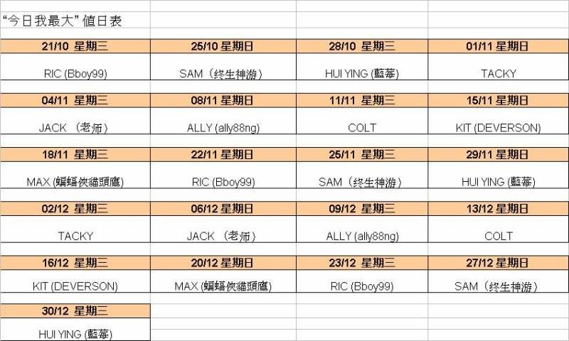 | 雄爷和猫头鹰建议作的值日生表~ | | | | 当天值日的人就是我们的“猪长“ | | | 当我们的猪长必须 | | | -开始前发表自己的想法言论 | | -维持大家表演的次序 | | -控制时间 | | -维持良好的学习环境 | | -结束前重复确认东西收拾整洁,水电全关 |