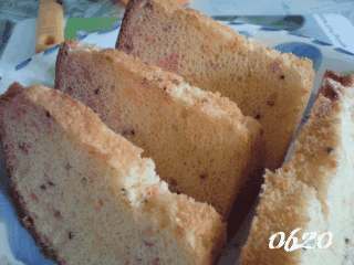 面包很美哦!天然颜色就是这样的,改次看道颜色鲜艳的蛋糕你就心里有数了,要放很多色素啦! |