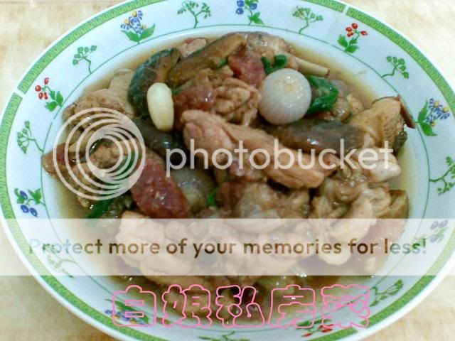 做法:下2汤匙油,爆香蒜瓣葱头,下鸡肉快炒至鸡肉收缩,下腊肠,,炒出香味,下调味料