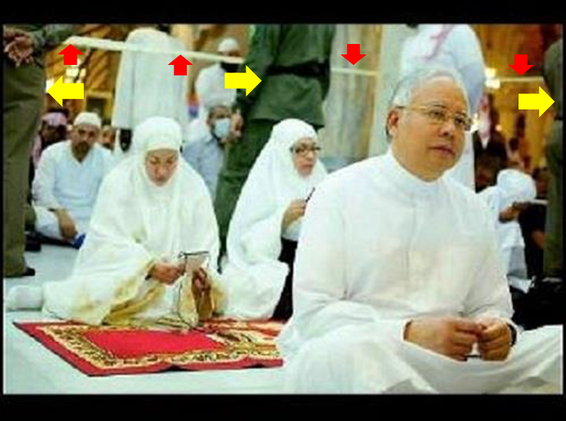 Terbaru, paling menakjubkan kawalan yang begitu ketat bukan saja diberikan kepada Najib dan Rosmah ketika mereka tawaf atau bergerak (berjalan) sewaktu menunaikan haji, malah ia turut melibatkan mereka ketika beribadah di dalam masjid (Nabi) sekali pun. Bayangkan, pihak tentera Arab Saudi telah menggunakan tali "no crossing" untuk menghalang orang ramai berada dalam kawasan mereka beribadah. Tidak cukup dengan itu, kawalan keselamatan oleh pengawal juga turut disediakan kepada mereka. Bukankah, ini sesuatu yang tidak pernah kita saksikan selama ini. Tidak munasabah dan masuk dek akal bila mana seorang "makhluk Allah" boleh mendapat kemudahan sehebat itu ketika beribadah di dalam masjid yang terletak di Tanah Suci. Soalnya sekarang, apa yang ditakutkan oleh Najib Razak dan Rosmah Mansor agaknya?. Langkah menggunakan pengawal sebegitu rupa di dalam masjid jelas menunjukkan mereka begitu "riak, takabur dan bongkak" iaitu salah satu sifat tercela dalam Islam.