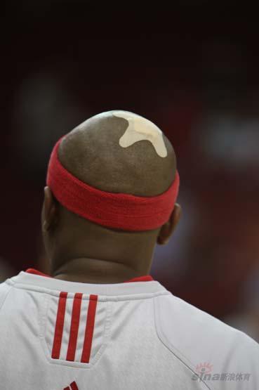从这次季前赛开始,维尔斯就一扫之前留在大家心目中的颓势,积极的突破和跑动实在是让人耳目一新。不过今天的比赛中,维尔斯光是上场就让大家吓了一跳。虽然说一个大光头也谈不上什么发型,但是维尔斯头上既然有一个非常醒目的四角星,实在让人觉得有些不可思议。仔细看看,才发现是因为前端时间在训练中受伤,头上贴个胶布。
