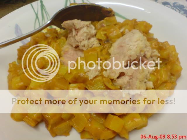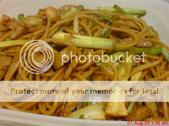 蒜香花肉炒Spaghetti - 这便当有一半请了小弟弟吃(他还吃两个Puff当早餐呢)我笑他说如果我年轻十来岁,别人一定以为我是在追他了,哈!另一半的便当原本是我的午餐,但因为有事要办,结果也送了给我part time的同事吃了, 安慰的是同事都说很好吃