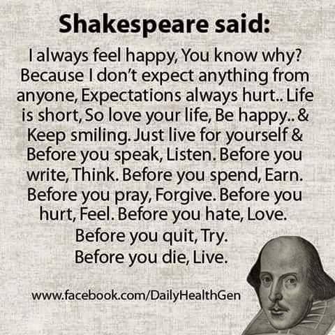 和大家分享,莎士比亚名句:“我总是感到快乐,你知道为什么吗?因为我不期望任何人任何事物,期望总是会让人失望的。生命短暂,要懂的享受生活并常保持笑容。多为自己而活。讲话之前先听。写之前先想。花钱之前先赚。祈祷之前先大量。未受伤前先感受。要恨之前先试着去爱。要放弃之前先去尝试 。在死之前好好生活。”