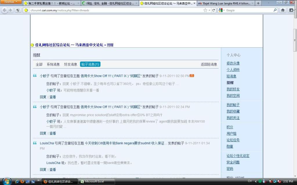 来报告一下,之前打电话去cancel我另外2张炸弹卡,职员offer我一张RM100,诱惑我保留。抵挡不住诱惑,点了头 ... mypromise 发表于 9-11-2011 10:20 AM