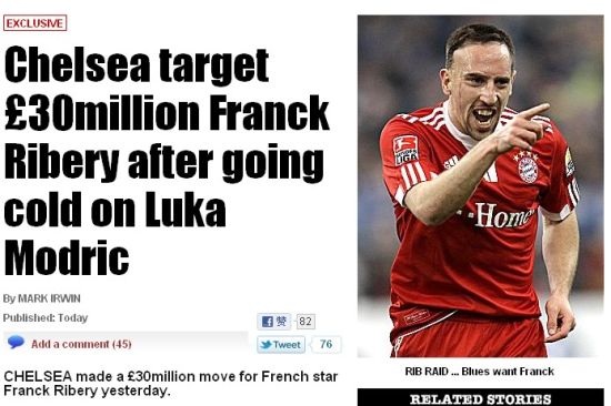《太阳报》同时透露,拜仁慕尼黑俱乐部对于里贝里的心理价位是3600万英镑,两年前时任切尔西主帅的安切洛蒂也曾对里贝里垂涎三尺,不过当时的拜仁主席霍内斯为里贝里的标出了高达8800万英镑的天价。