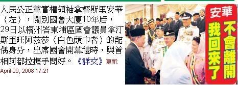 安華西裝筆挺及戴宋谷,今日滿臉笑容陪同妻子出席國會開幕禮后,也有幸進入貴賓室與國家元首共享茶點。